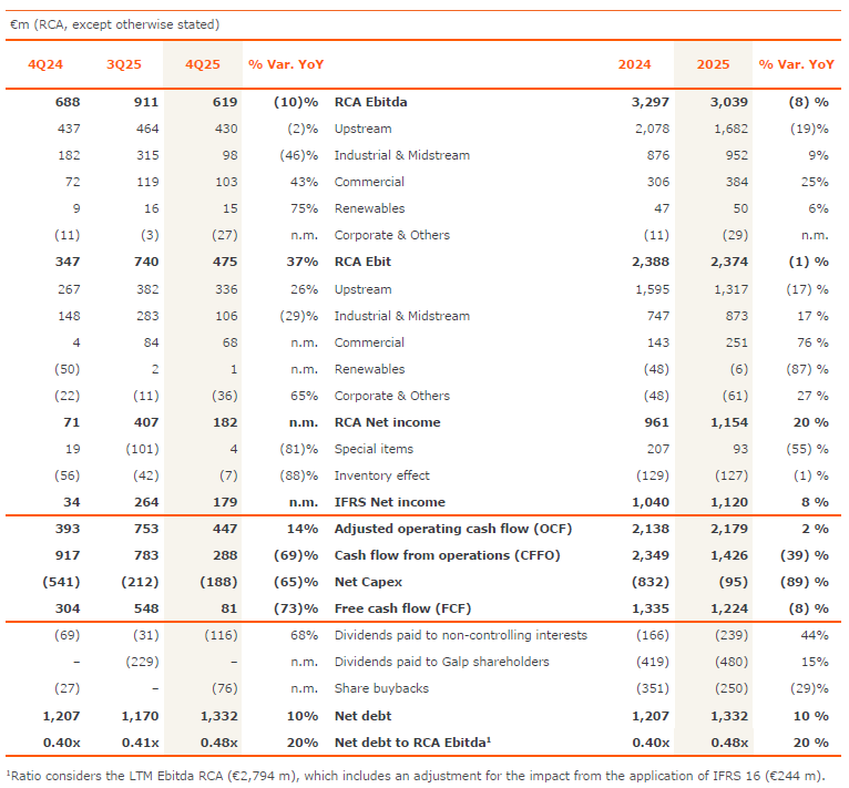 Galp delivered a robust operational and financial performance in the fourth quarter of 2025, with strong contributions from Upstream, Midstream and Commercial partially mitigating a less supportive macro environment and considering the large planned industrial turnaround in Sines refinery. Operating performance translated into solid cash generation, with net debt standing at €1.3 bn by the end of the period.